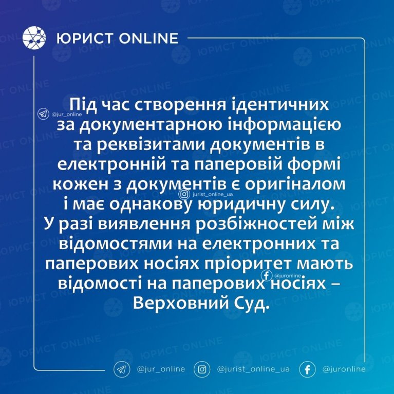 Під час створення ідентичних за документарною інформацією та реквізитами документів в електронній та паперовій формі кожен з документів є оригіналом і має однакову юридичну силу. У разі виявлення розбіжностей між відомостями на електронних та паперових носіях пріоритет мають відомості на паперових носіях – Верховний Суд.